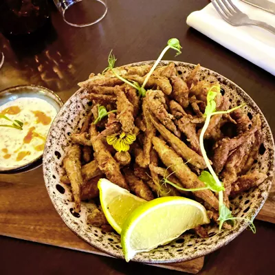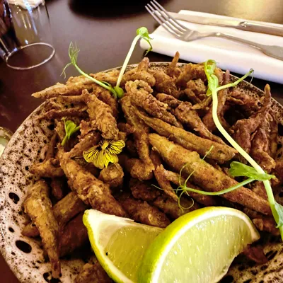 Assiette de friture d’éperlans croustillants, dorés à la farine, au paprika fumé et au panko pour une texture légère. Servie avec une sauce au yaourt, à l’aneth, à la menthe et un filet de citron, pour une saveur rafraîchissante et herbacée qui met en valeur la douceur de l’éperlan méditerranéen.