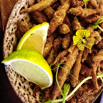 Éperlans, œuf, farine, paprika fumé, panko, yaourt, aneth, menthe, citron.