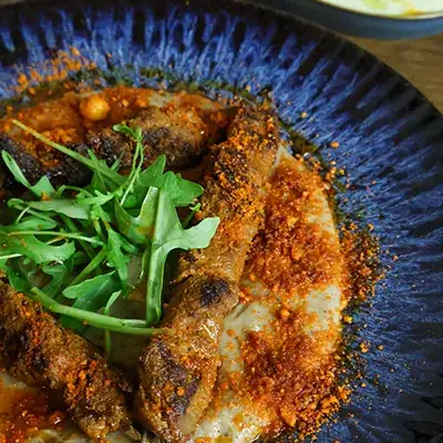 Trois brochettes Brochette de cœur de rumsteck , assaisonnées d’épices marocaines et grillées au barbecue pour une saveur intense et fumée. Elles sont servies avec une purée de chou-fleur délicatement parfumée au sumac, relevée d’un filet d’huile d’olive extra vierge pimentée, qui apporte une touche chaleureuse et raffinée à la française.