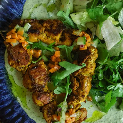 Greek-style marinated chicken skewers with homemade tzatziki sauce. Served with a salad of arugula and iceberg lettuce, cherry tomatoes, lemon, and extra virgin olive oil.