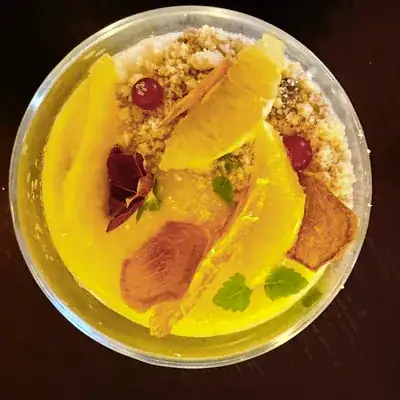 Panna cotta onctueuse, délicatement parfumée à la fleur d’oranger, servie avec une crème d’orange soyeuse, accompagnée de suprêmes d’orange pour une touche de fraîcheur acidulée. Un dessert raffiné.