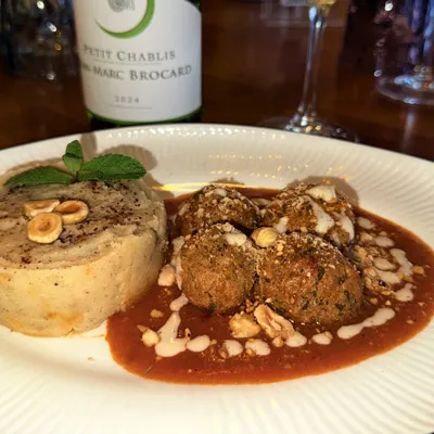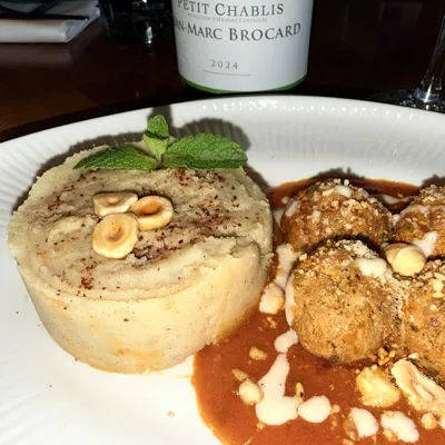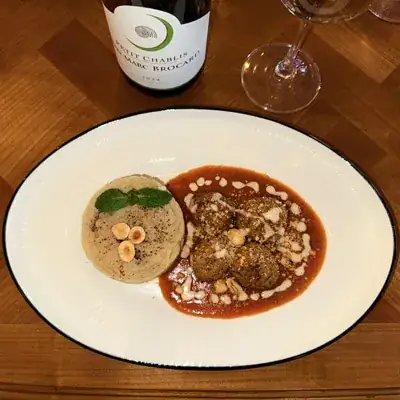Un voyage gourmand au cœur de l’Anatolie. Nos tendres boulettes de poulet aux noisettes sont dressées sur un nid de sauce tomate maison au Parmesan, offrant un équilibre parfait entre acidité et richesse. Servies avec une purée de pommes de terre onctueuse, l’ensemble est sublimé par des noisettes concassées pour un maximum de croquant et quelques feuilles de menthe fraîche. Une explosion de saveurs et de textures.