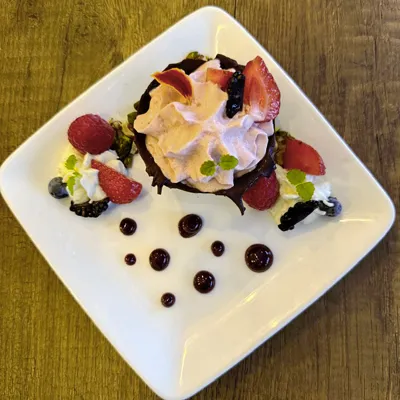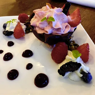 Une délicate coque en chocolat finement travaillée. À l’intérieur, une crème douce aux fruits rouges frais, accompagnée de noix concassées pour un petit croquant agréable. Un dessert simple et gourmand.