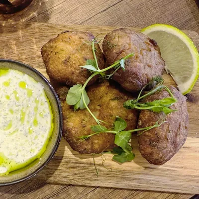 Délicates galettes de kefta, dorées à la perfection, préparées avec une base d’anchois et de pommes de terre fondantes. Elles sont accompagnées d’une sauce citronnée, fraîche et légère, pour un équilibre parfait entre saveurs marines et acidulées.