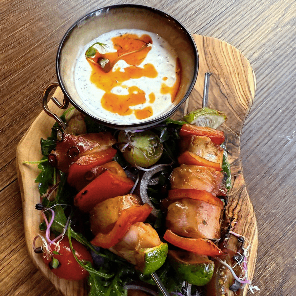 Deux brochettes de poulpe tendres et savoureuses, accompagnées de poivrons colorés et citronnés, grillés à la plancha pour un goût parfaitement fumé et parfumé. Elles sont servies avec une sauce rafraîchissante au yaourt, aromatisée à l’aneth et au citron, apportant une touche de fraîcheur et d’acidité pour sublimer ce plat aux saveurs marines et méditerranéennes.