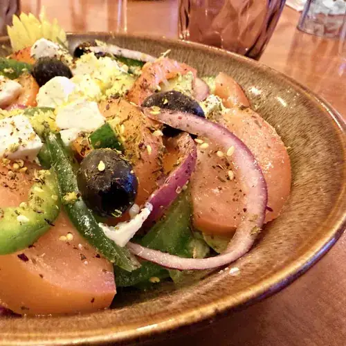 Croquant & Fondant. Effiloché d’iceberg, tomates gorgées de soleil, poivrons verts, concombres, fines rondelles d’oignons rouges et olives noires. Une généreuse feta crémeuse trône au sommet, relevée par le parfum boisé du zaatar et la fraîcheur des zestes de citron. Le tout est lié par une huile d’olive extra vierge et un vinaigre de caractère.