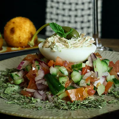 Salade fraiche aux saveurs méditerranéennes avec un mélange coloré et rafraîchissant de tomates juteuses, de concombres croquants et d’oignons finement émincés. Garnie de thon savoureux, d’œufs durs, de piments relevés et d’olives parfumées, le tout généreusement arrosé d’huile d’olive extra vierge. Une assiette authentique tunisienne, fraîche et pleine de caractère.