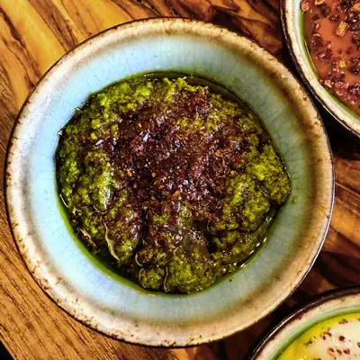 • Zhoug Yéménite( piments verts, coriandre, persil, menthe, ail,  de jus de citron et d’huile d’olive).