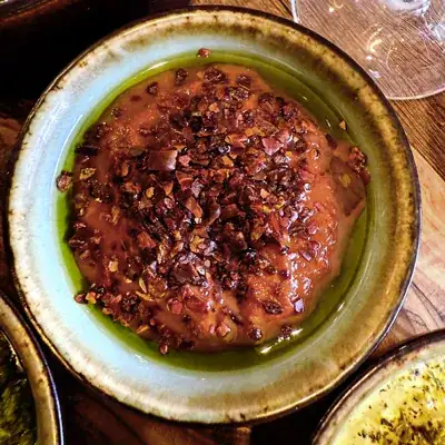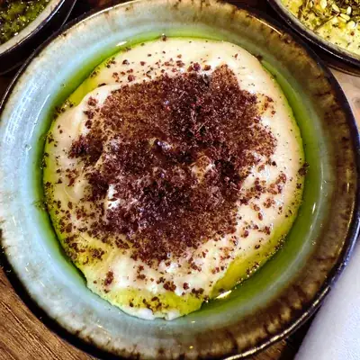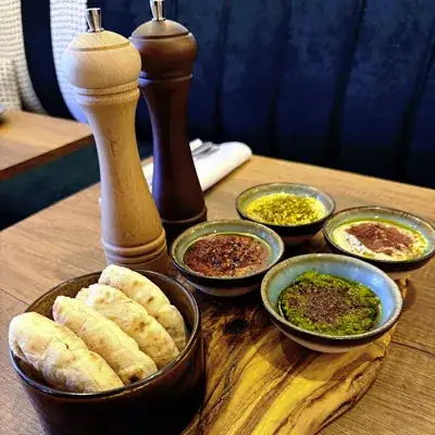 1 Tahini libanais (Sésame crémeux), 2 Yaourt grec au zaatar (Fraîcheur intense). 3 Harissa tunisienne douce (Poivrons fumés et épices)t.4. Zhoug yéménite doux : Pesto de coriandre , accompagné de pain pita chaud.