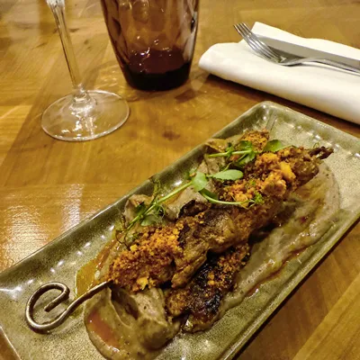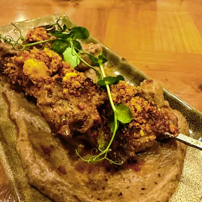 Two beef skewers with Mediterranean spices, served with cauliflower purée with sumac, hazelnut pieces, cumin, and smoked paprika.