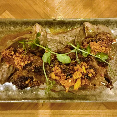 Two beef flank steak skewers seasoned with Mediterranean spices, grilled over the barbecue for an intense, smoky flavor. Served with a cauliflower purée subtly infused with sumac and enhanced with a drizzle of spicy extra virgin olive oil, bringing a warm French touch of finesse.