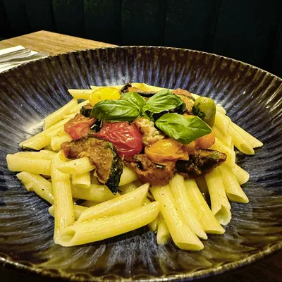Fresh pasta, delicately coated in a creamy tarragon-infused sauce, accompanied by tender roasted eggplant and oven-caramelized cherry tomatoes. A subtle blend of sweetness and aromatic freshness, elevating every bite with elegance and indulgence.