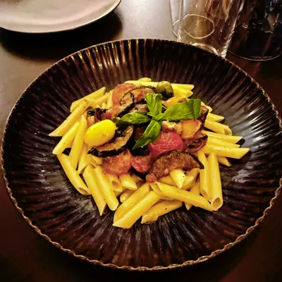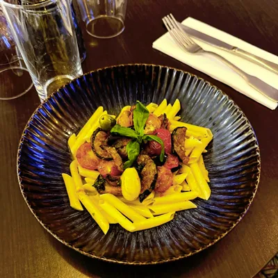 Fresh penne with tarragon, eggplant, cherry tomatoes, olives, basil, and extra virgin olive oil.